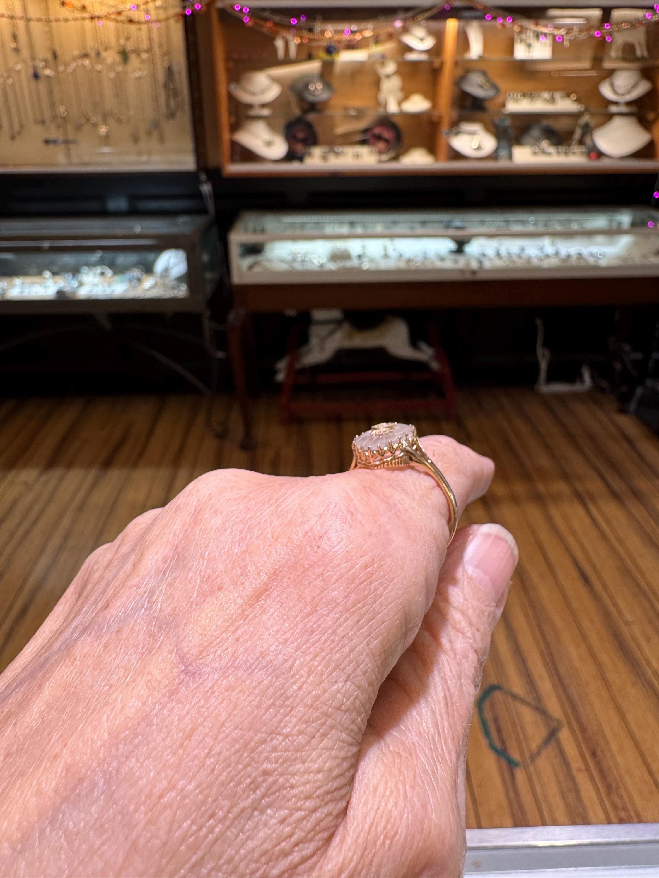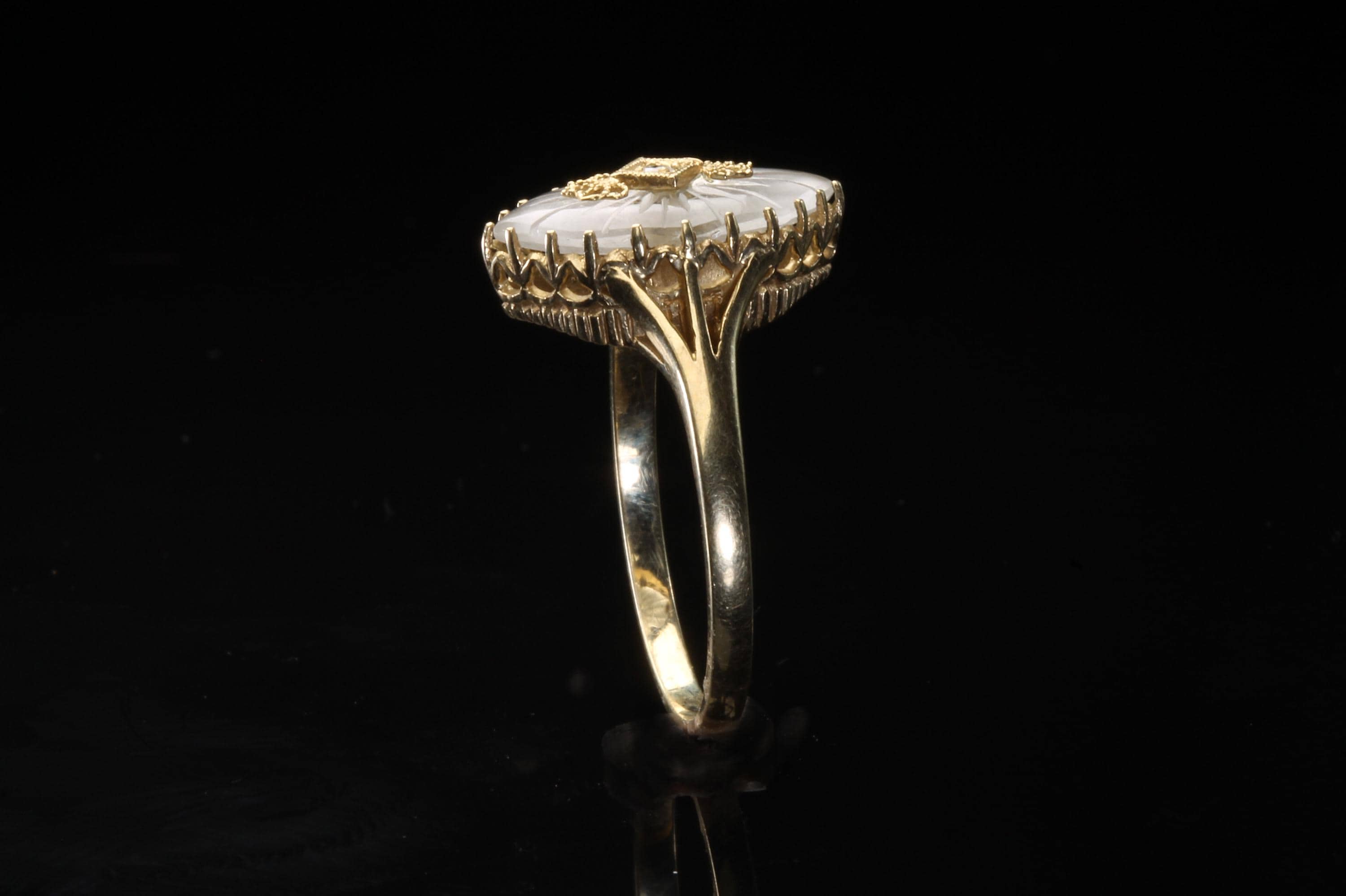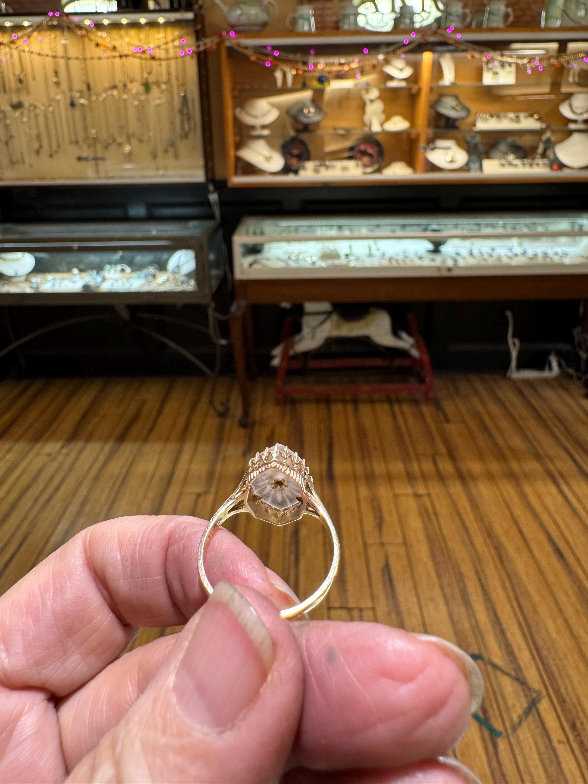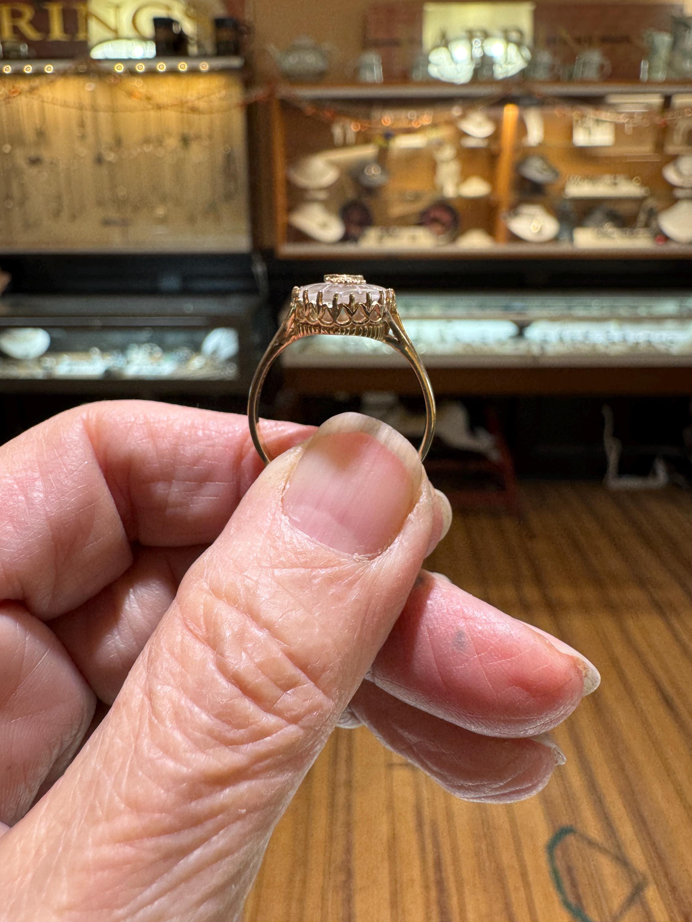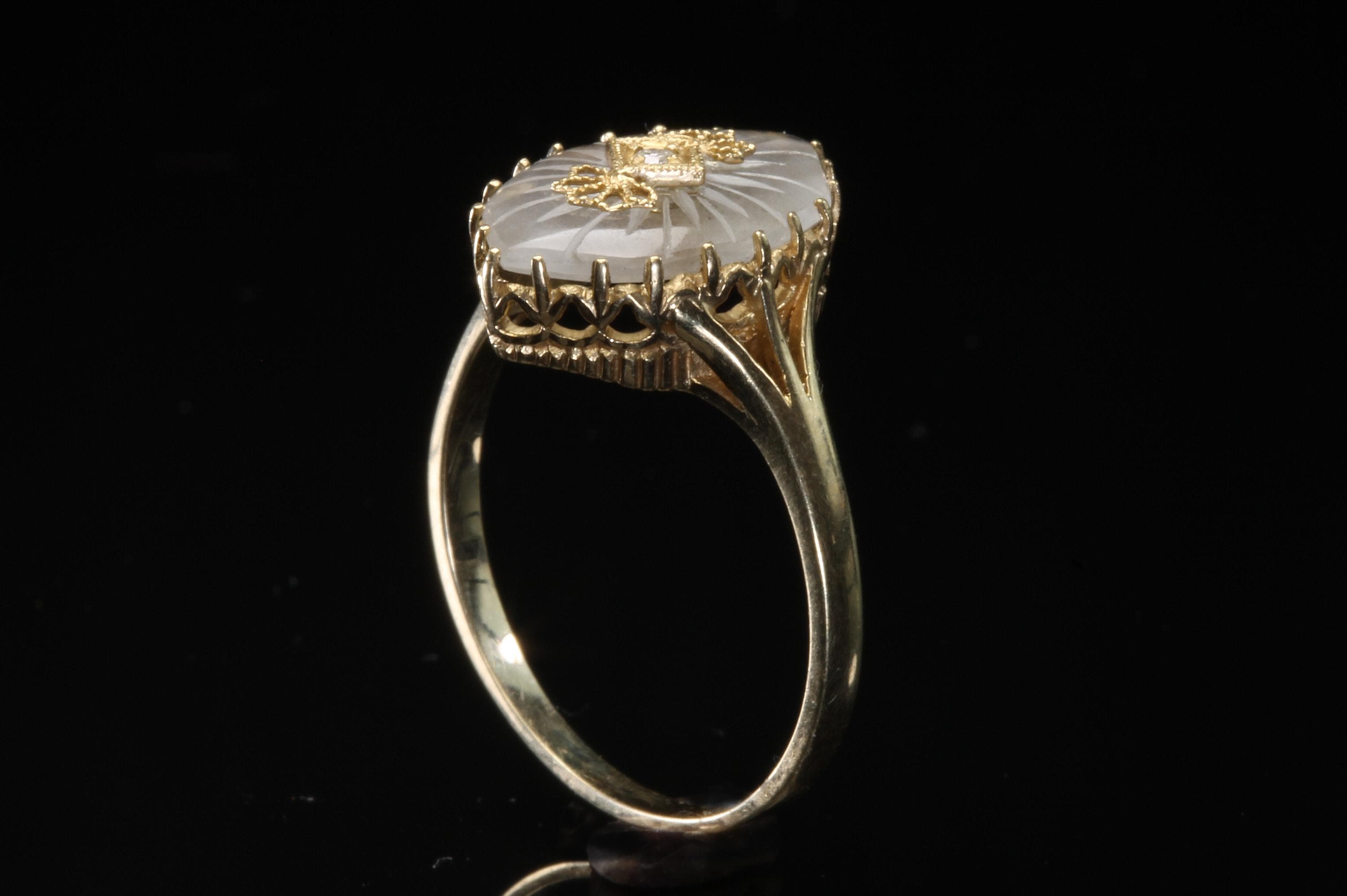 A lovely example of Art Deco style camphor glass jewelry. A 10K yellow gold ring featuring a starburst carved camphor glass stone which is set with a filigreed decorated 1.5mm diamond. A rather feminine look! This is a vintage and pre owned ring, sold as is in great ready to wear condition. Currently a size 9.5 we will size this ring up to a size 10.5 free of charge. If you need this ring to be larger than 10.5 please contact us before ordering.