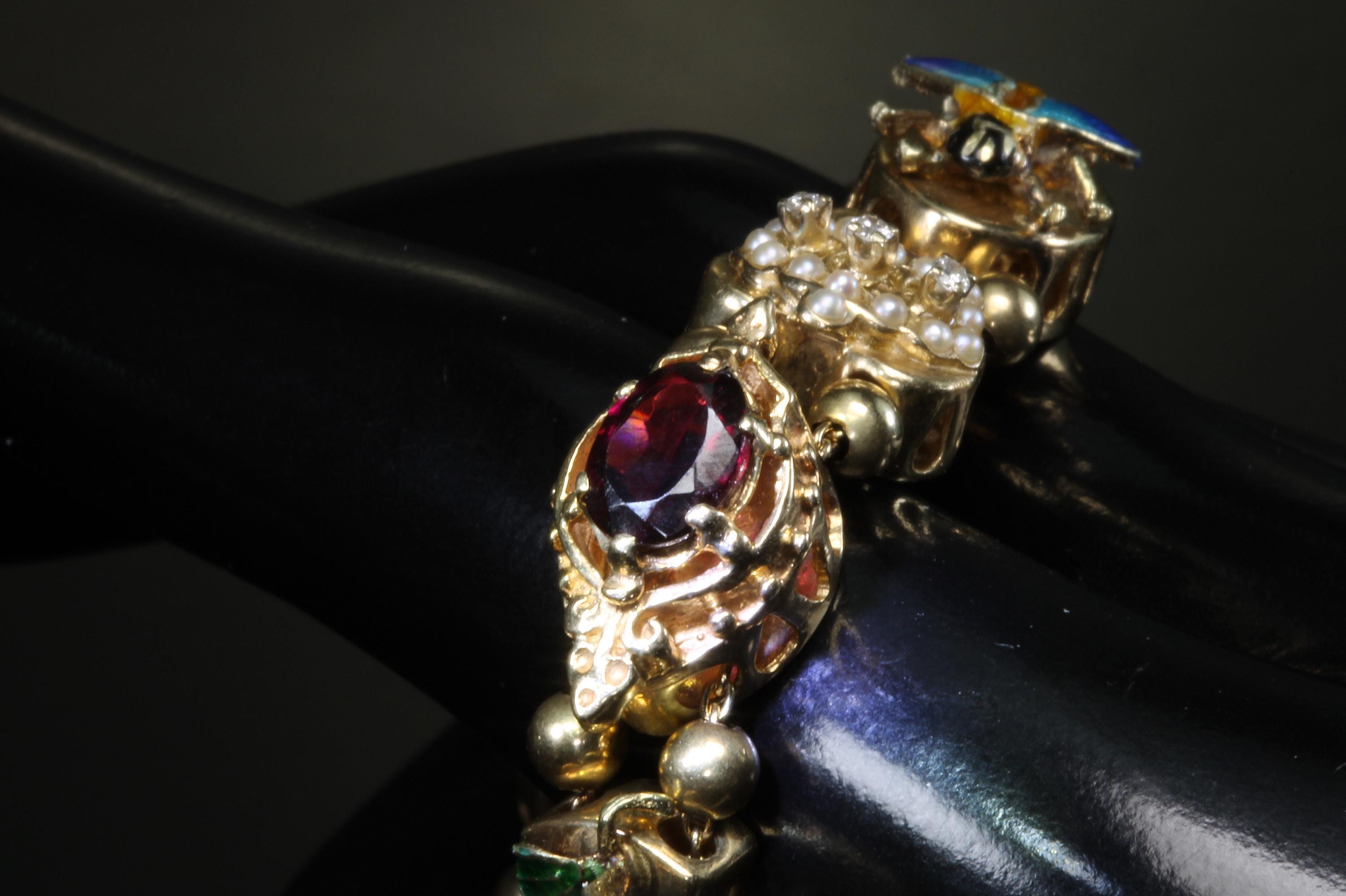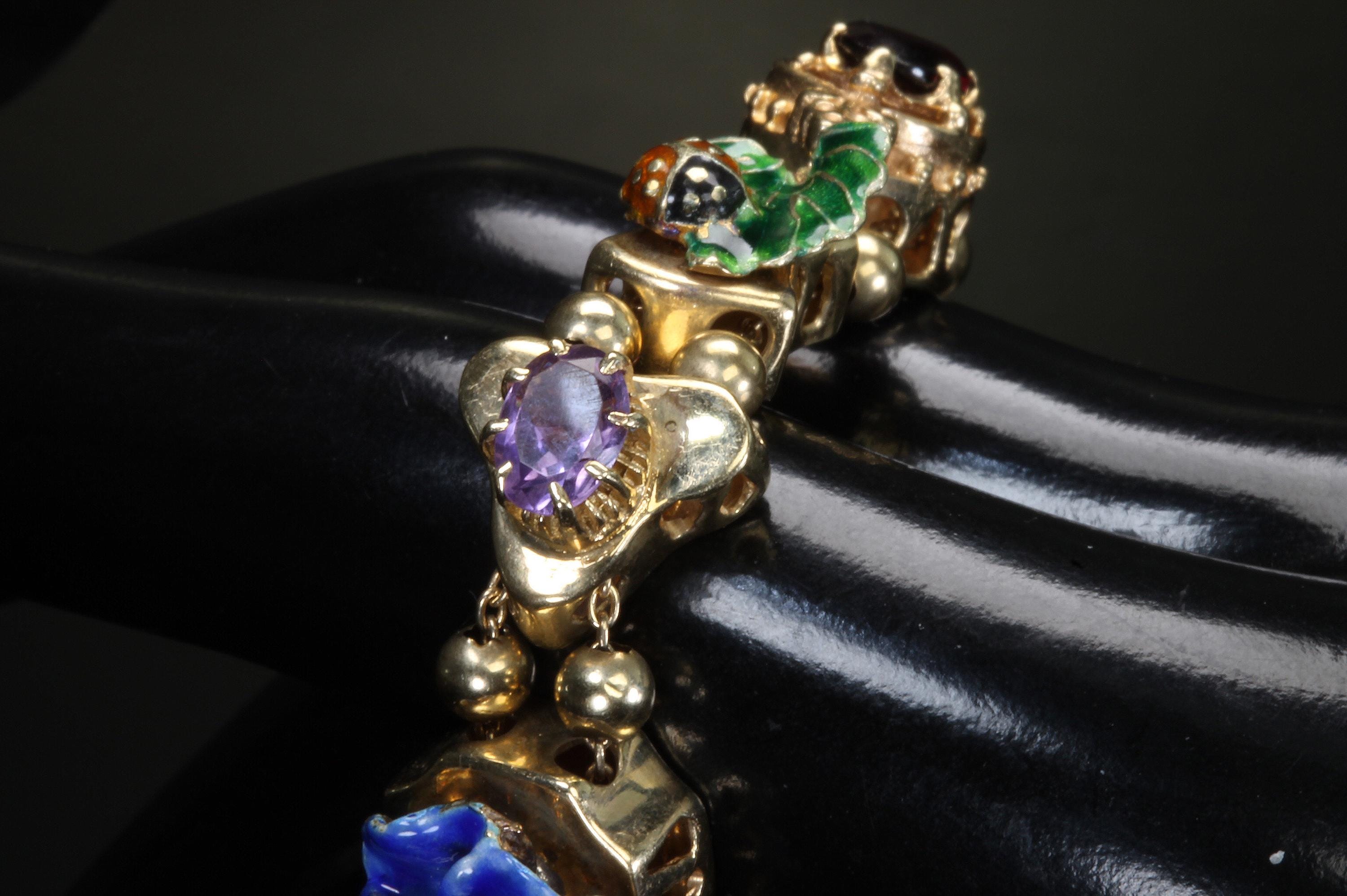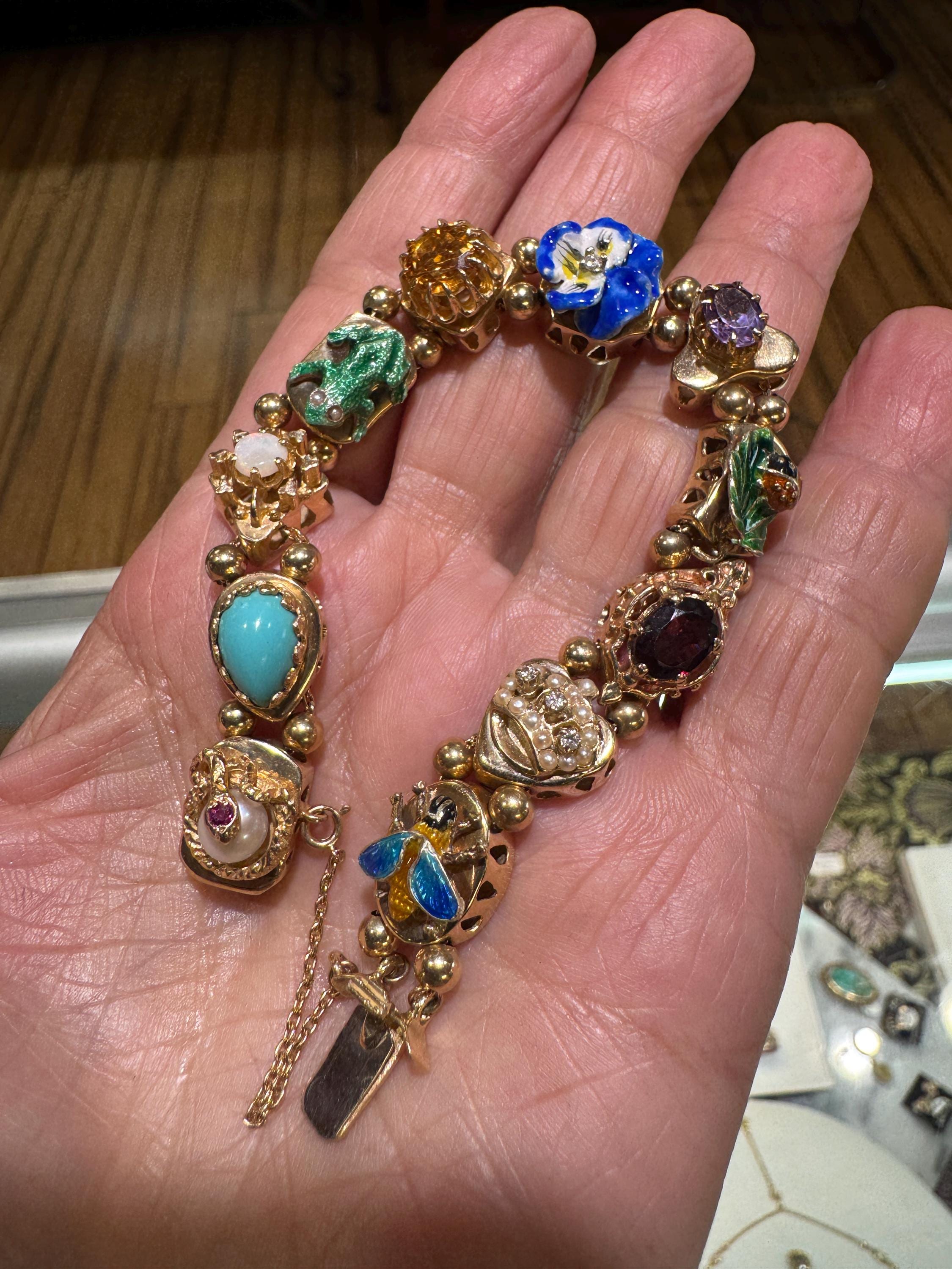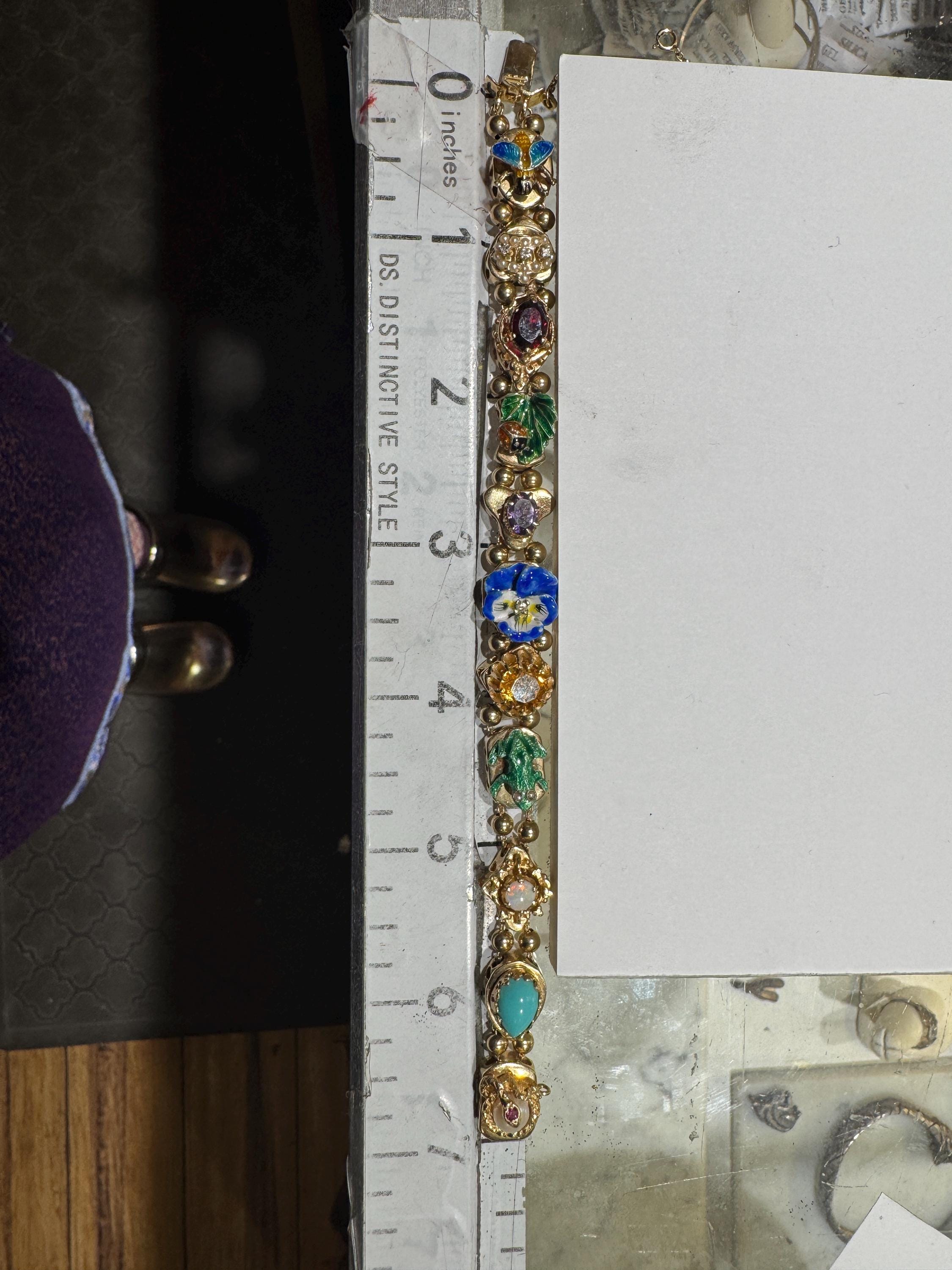 Now THIS is arm candy! Spectacular 14K yellow gold Victorian style charm bracelet. Weighing in at a hefty 23.3 dwt or 36.2 grams this bracelet features enameled critters and plants and gemstones and whimsy and colors and and and!!!! Measuring 7” this bracelets’ clasp works great and the safety chain has a spring ring on it for even easier use. I have not been able to find any damage to the enamel. There are very few signs of wear. This is a vintage and pre owned bracelet, sold as is in ready to wear condition. All the backs of each charm are inscribed with the makers hallmark (MA) and 14K