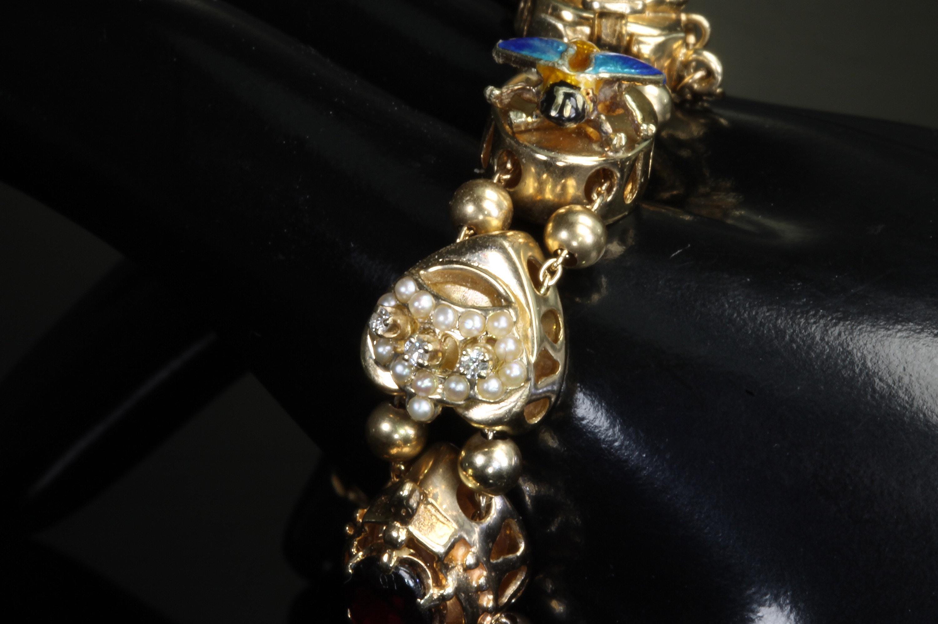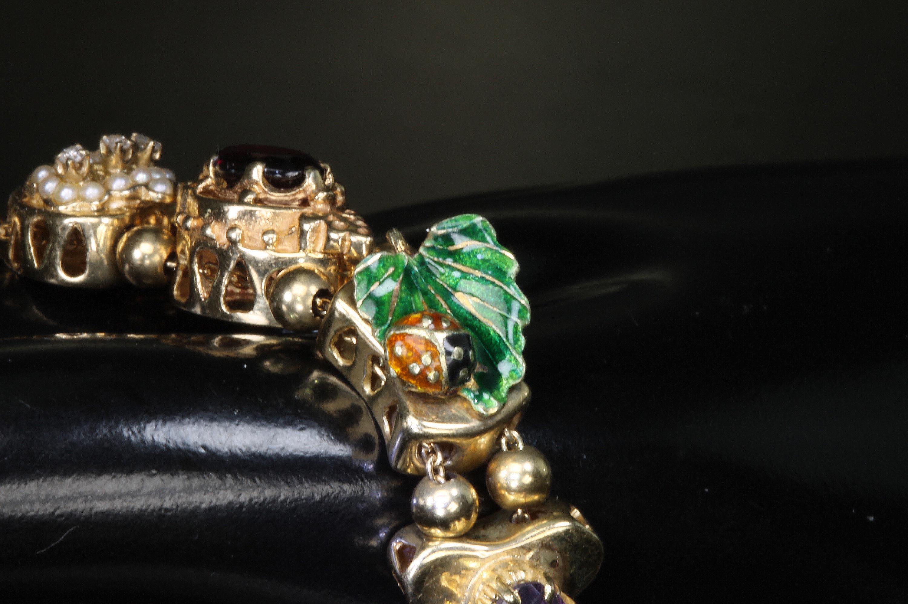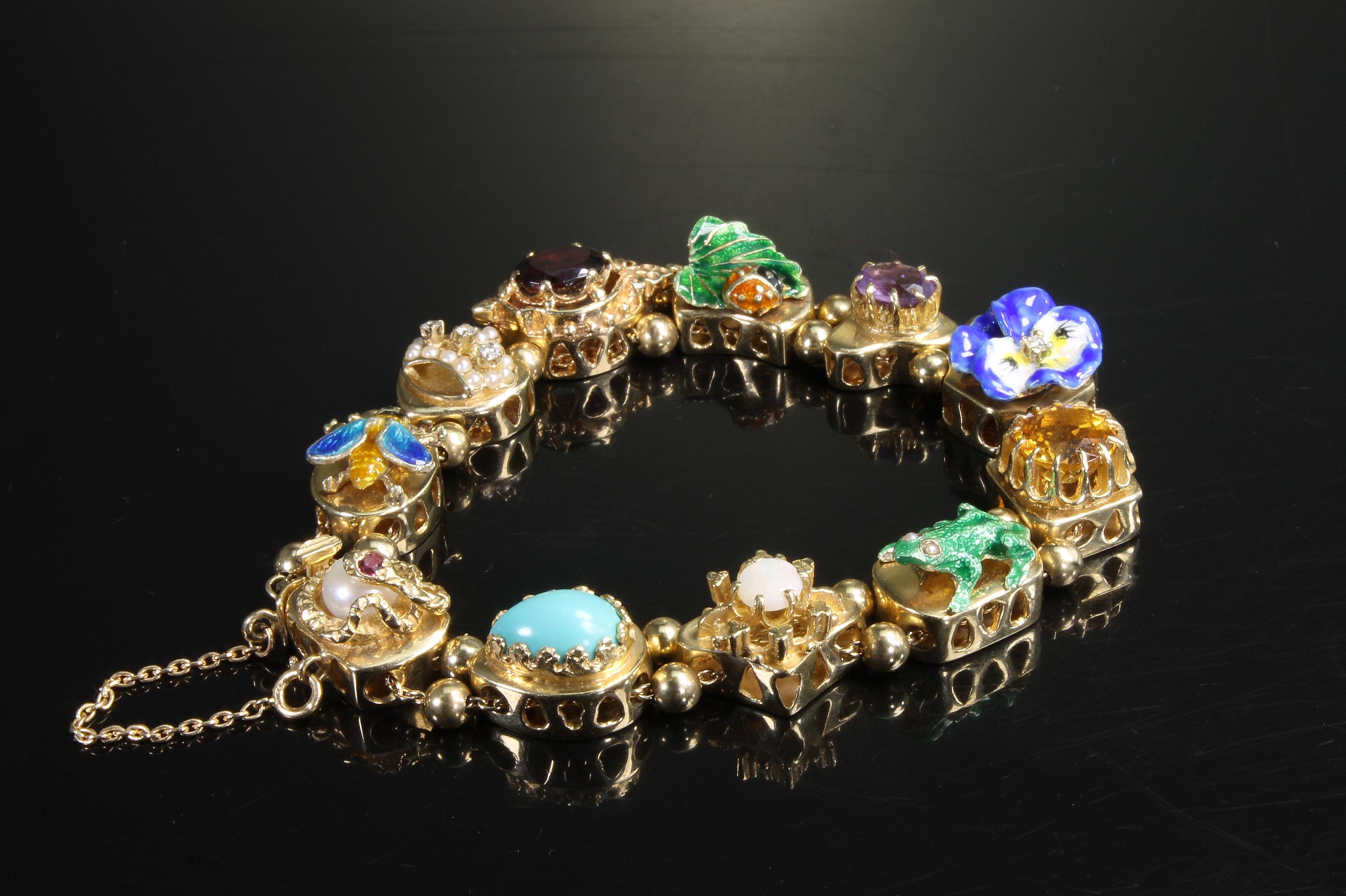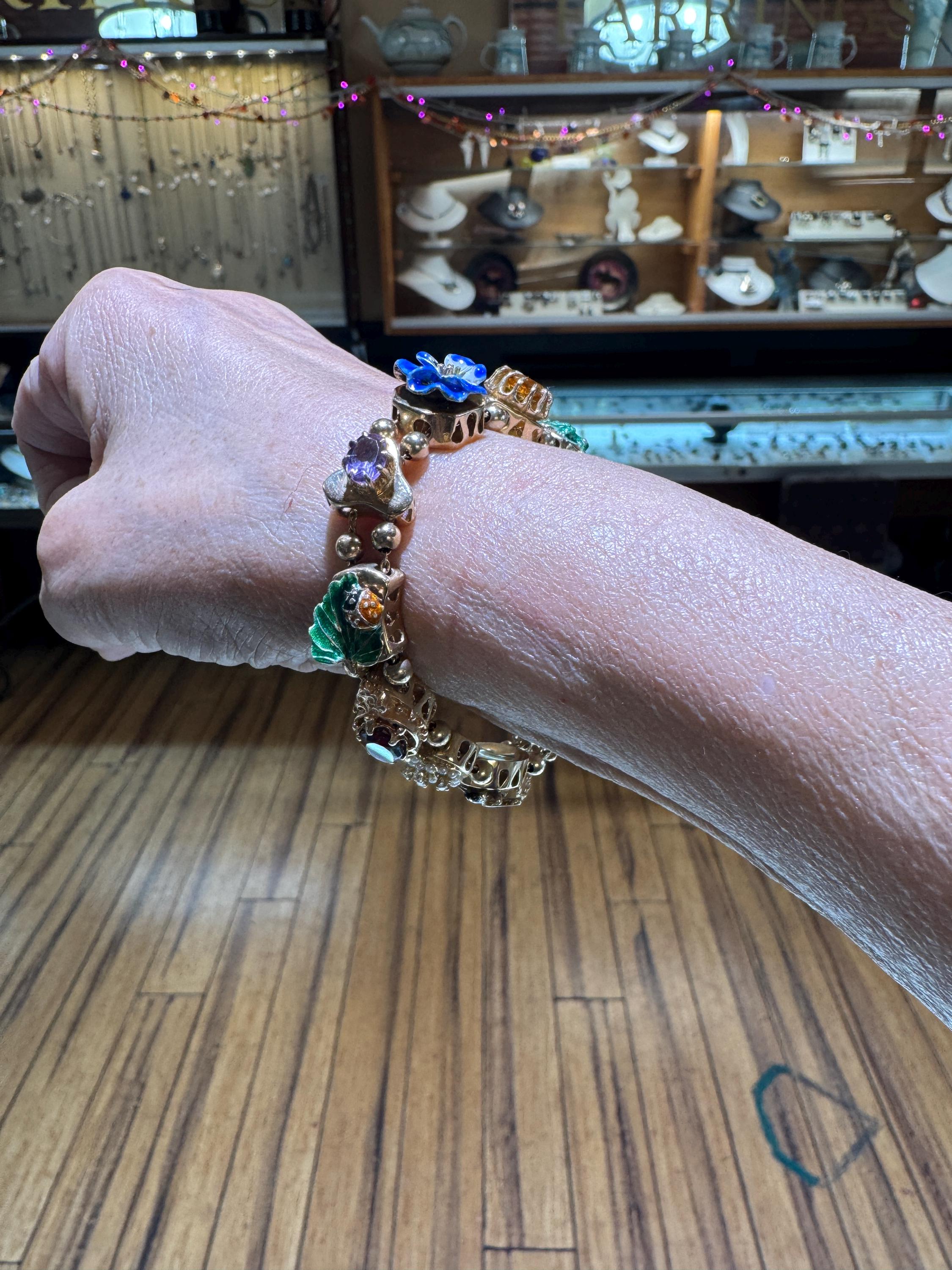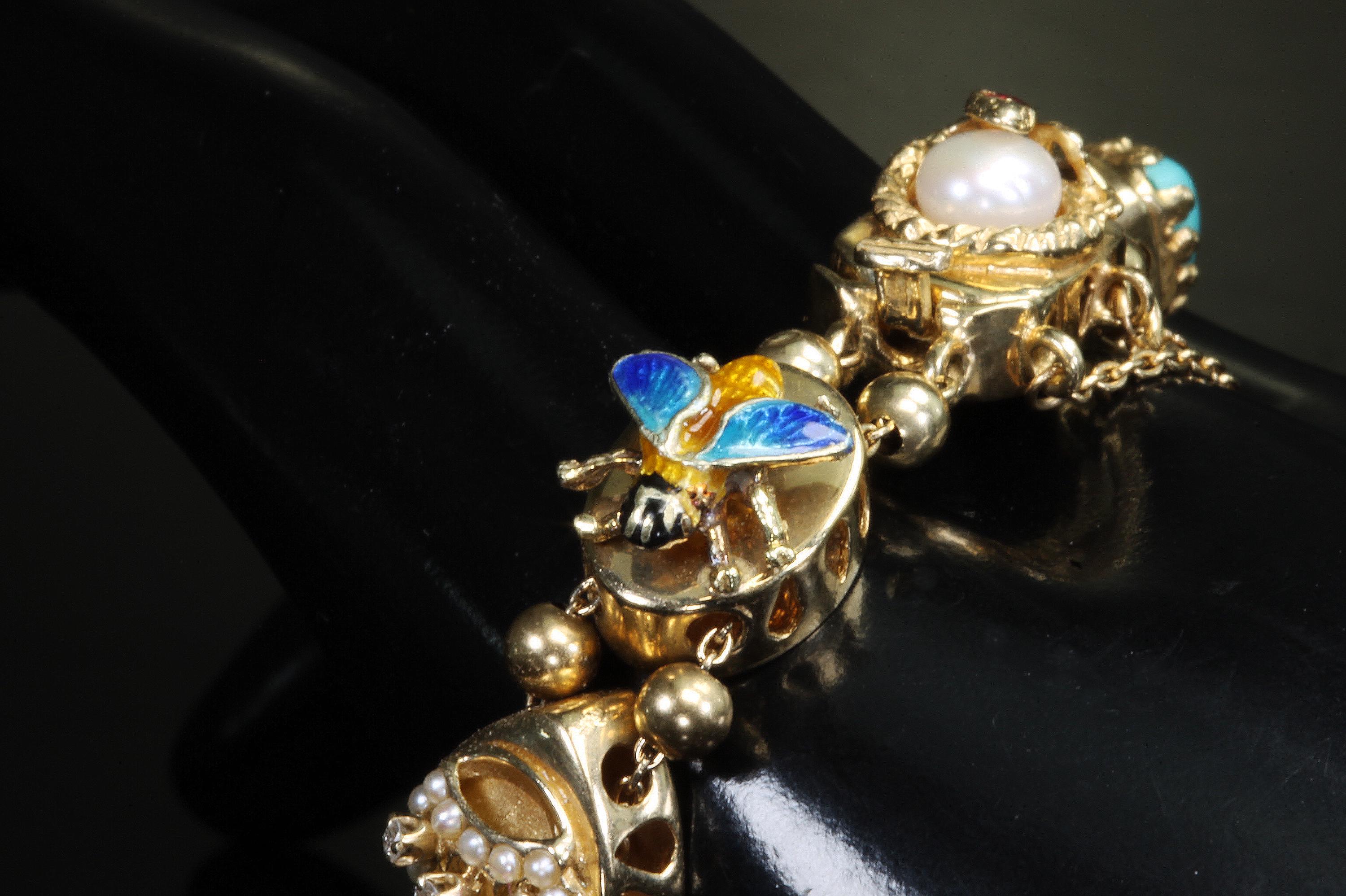 Now THIS is arm candy! Spectacular 14K yellow gold Victorian style charm bracelet. Weighing in at a hefty 23.3 dwt or 36.2 grams this bracelet features enameled critters and plants and gemstones and whimsy and colors and and and!!!! Measuring 7” this bracelets’ clasp works great and the safety chain has a spring ring on it for even easier use. I have not been able to find any damage to the enamel. There are very few signs of wear. This is a vintage and pre owned bracelet, sold as is in ready to wear condition. All the backs of each charm are inscribed with the makers hallmark (MA) and 14K