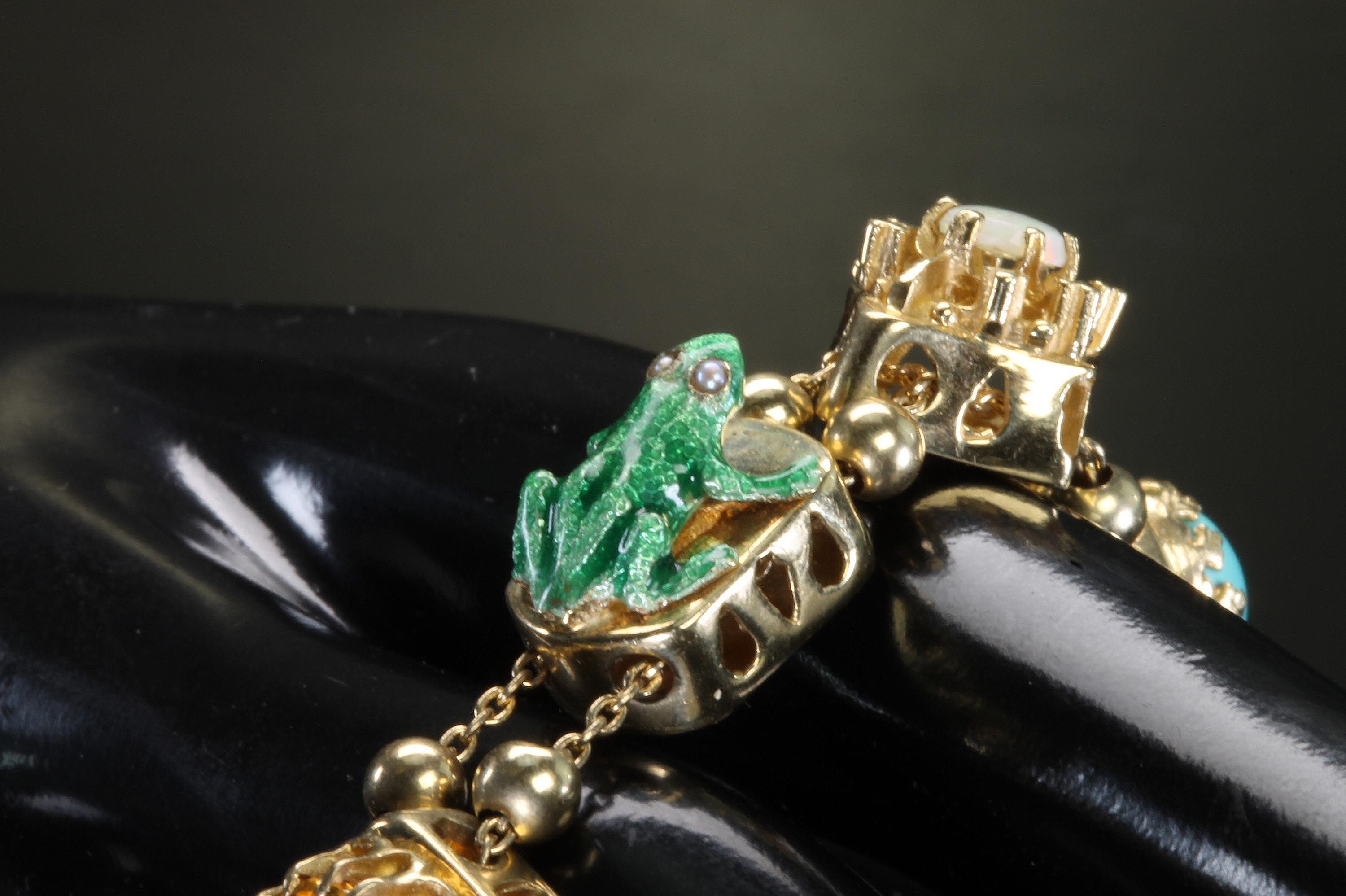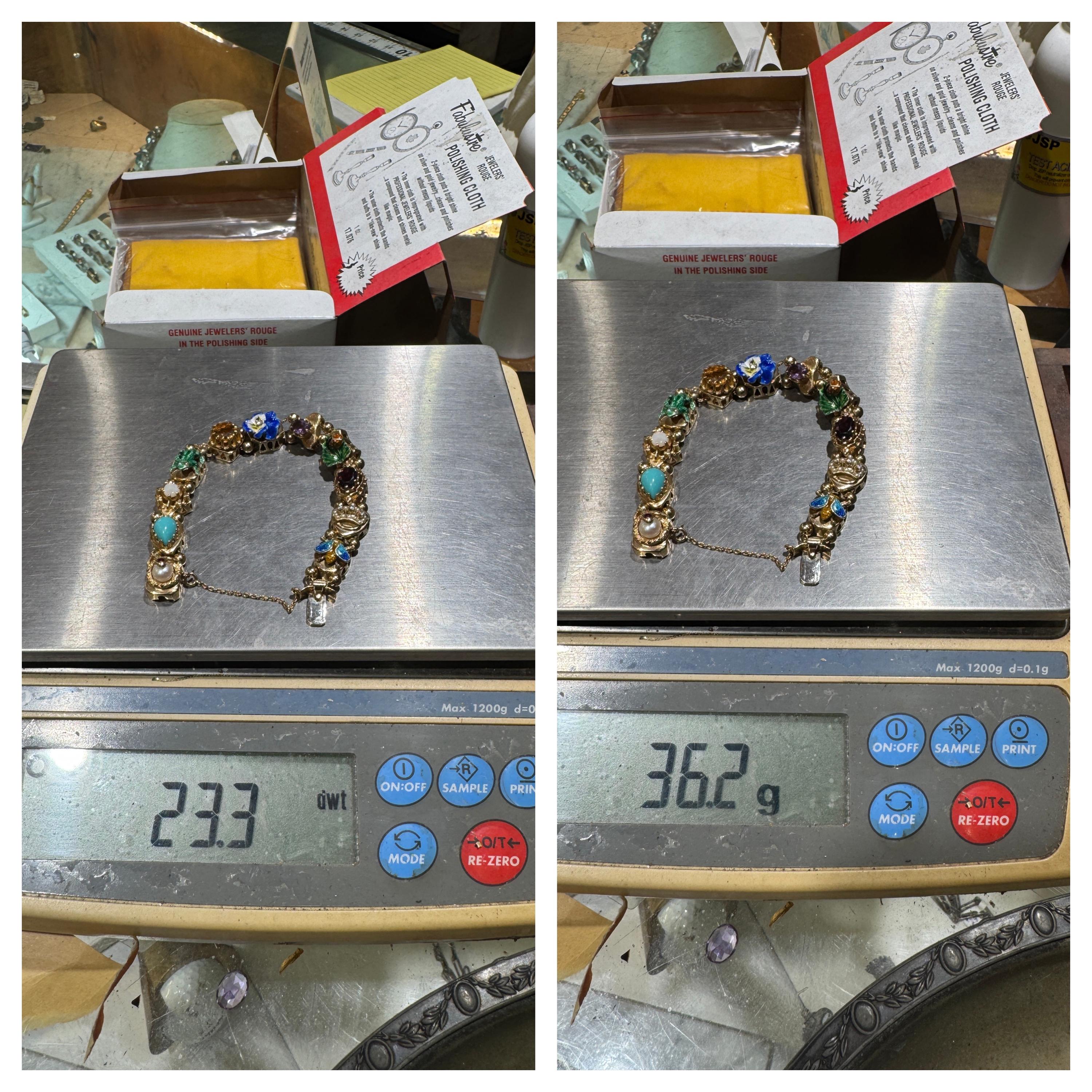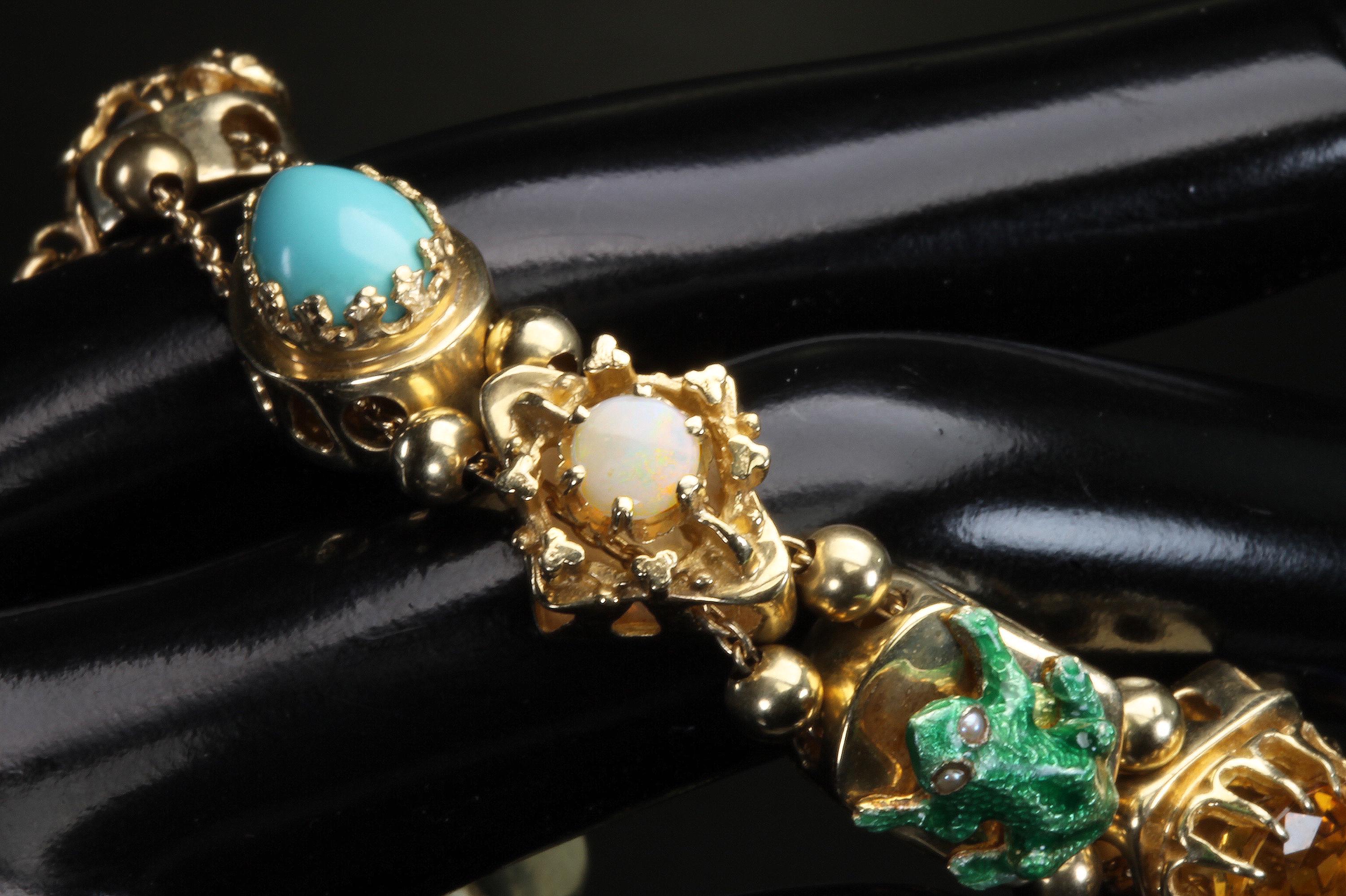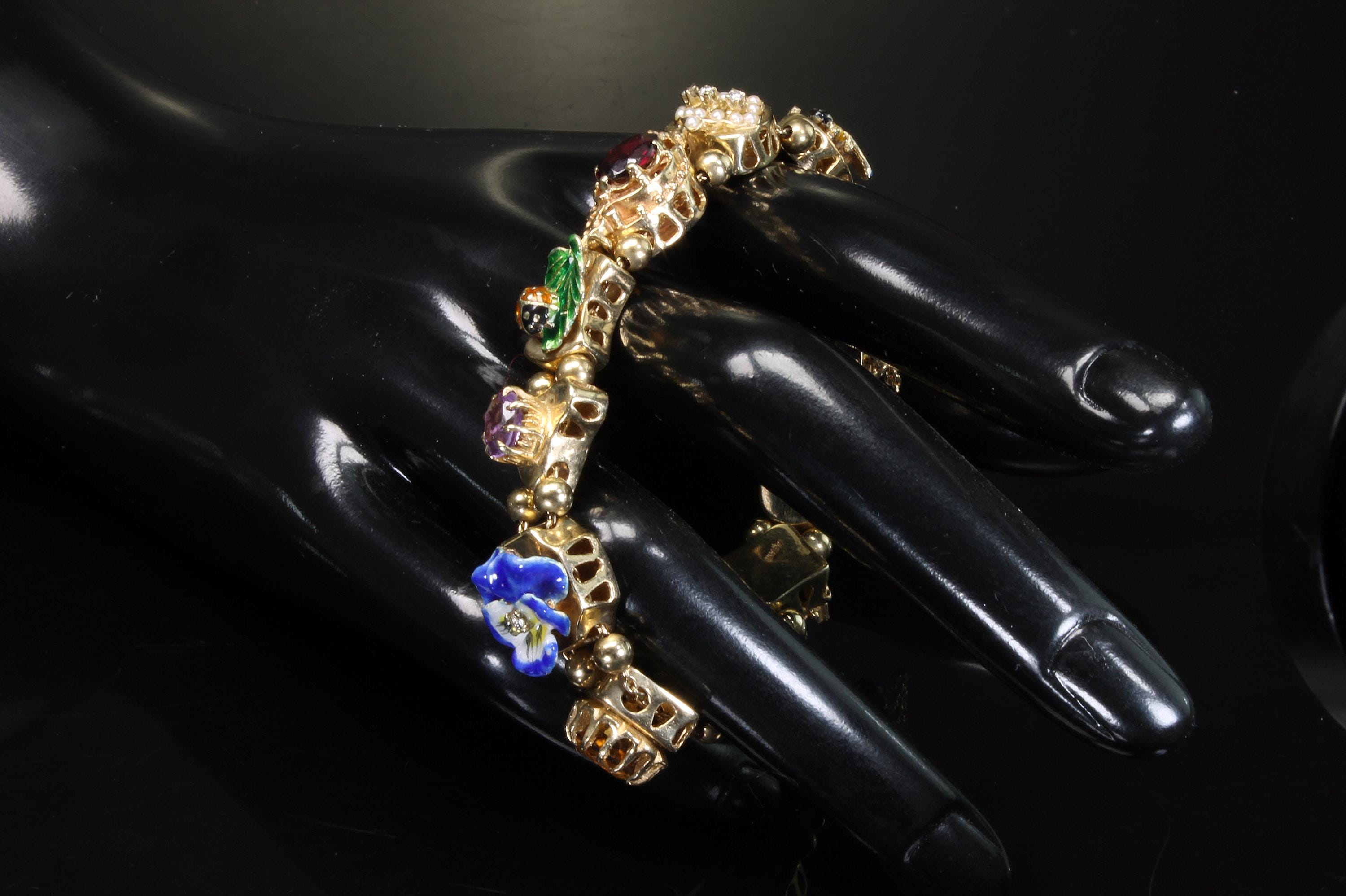 Now THIS is arm candy! Spectacular 14K yellow gold Victorian style charm bracelet. Weighing in at a hefty 23.3 dwt or 36.2 grams this bracelet features enameled critters and plants and gemstones and whimsy and colors and and and!!!! Measuring 7” this bracelets’ clasp works great and the safety chain has a spring ring on it for even easier use. I have not been able to find any damage to the enamel. There are very few signs of wear. This is a vintage and pre owned bracelet, sold as is in ready to wear condition. All the backs of each charm are inscribed with the makers hallmark (MA) and 14K