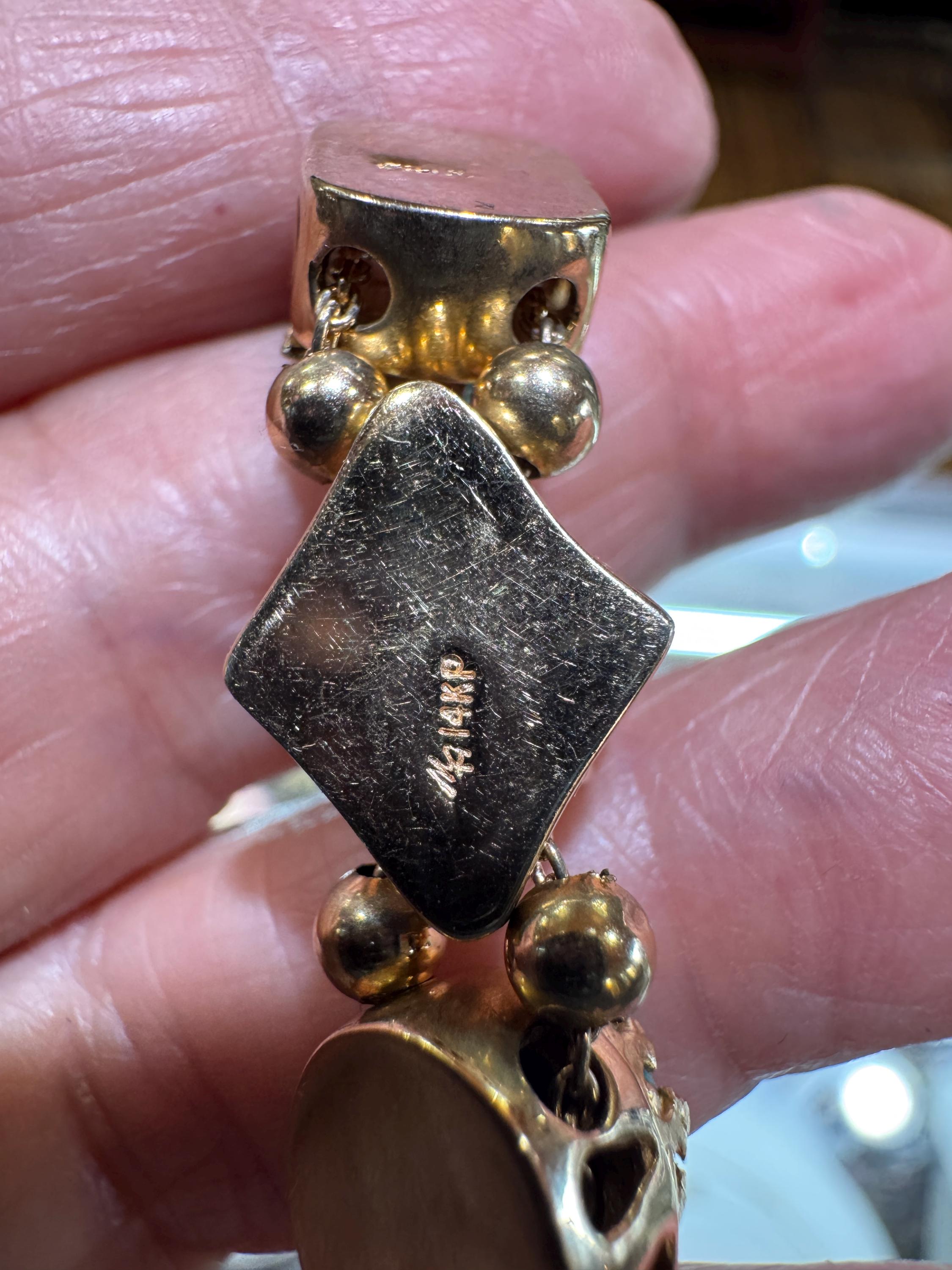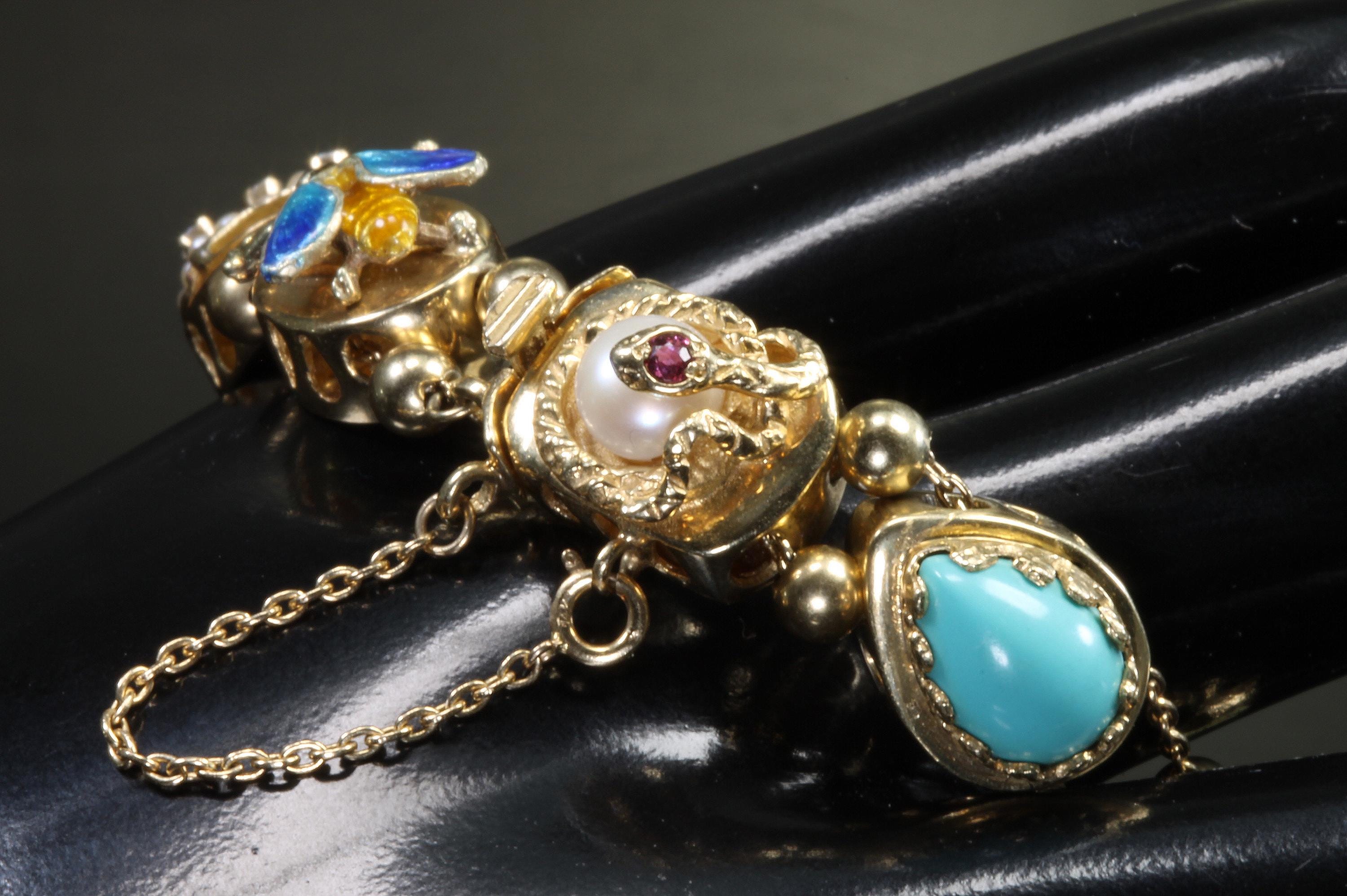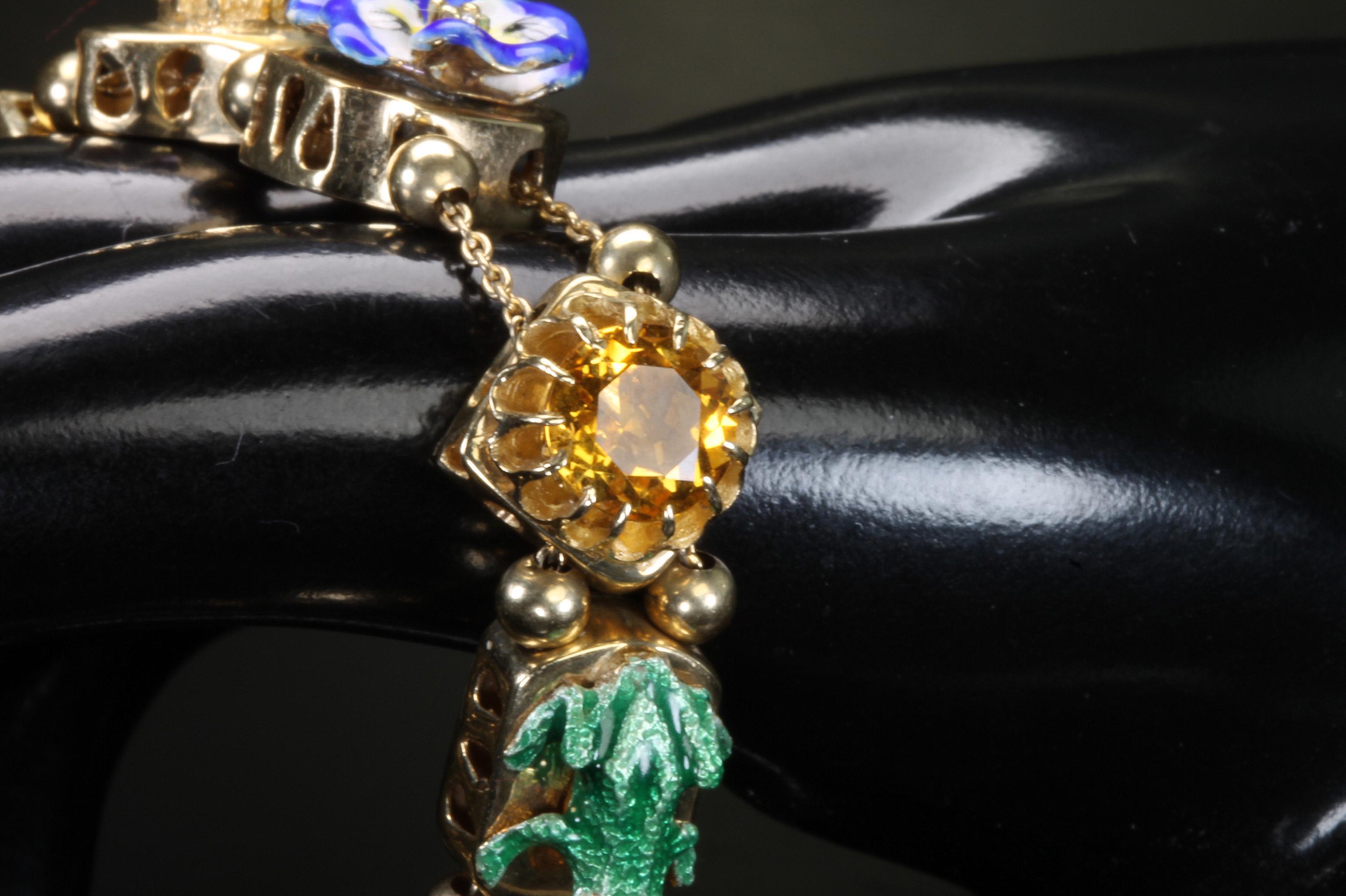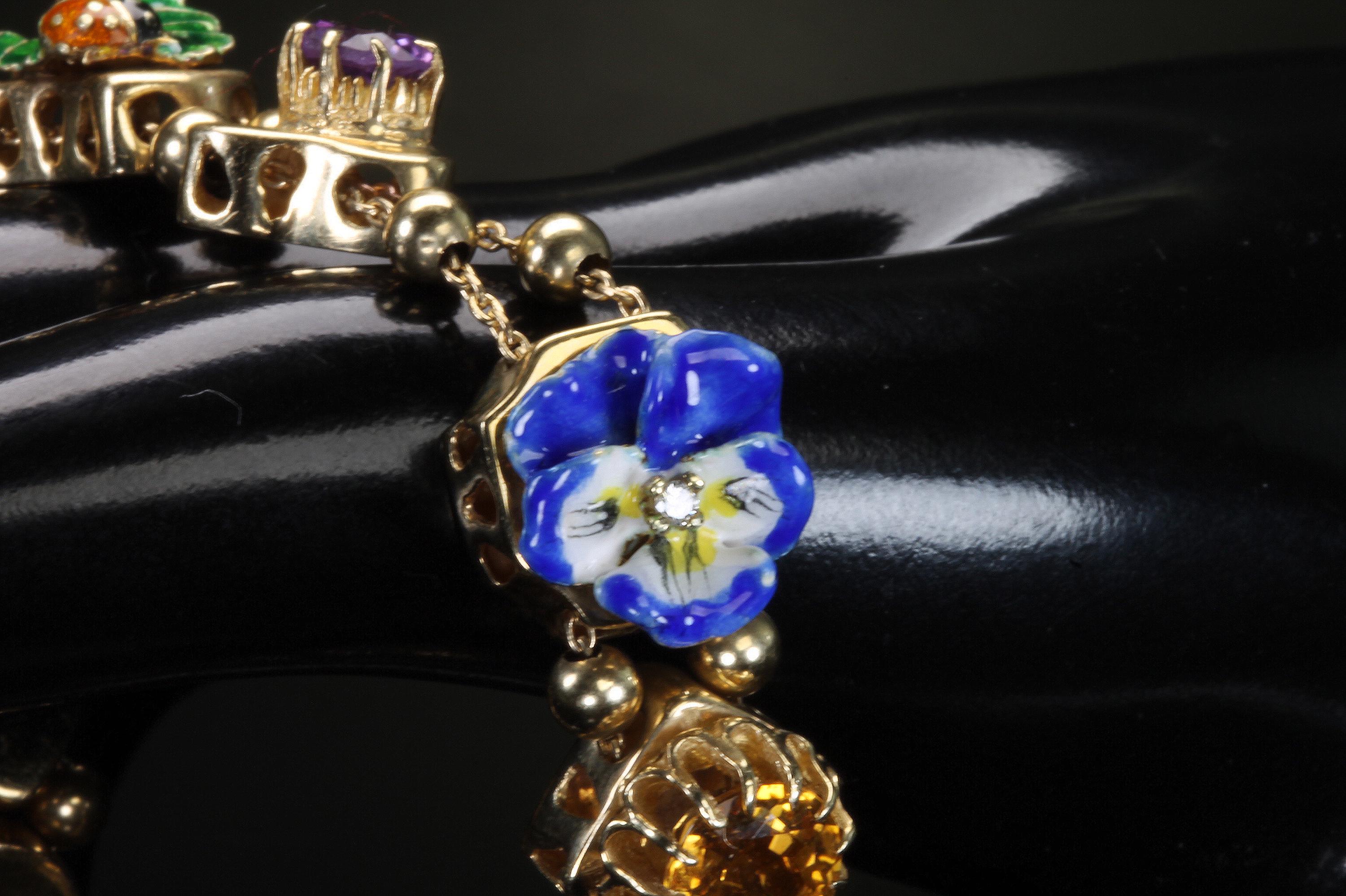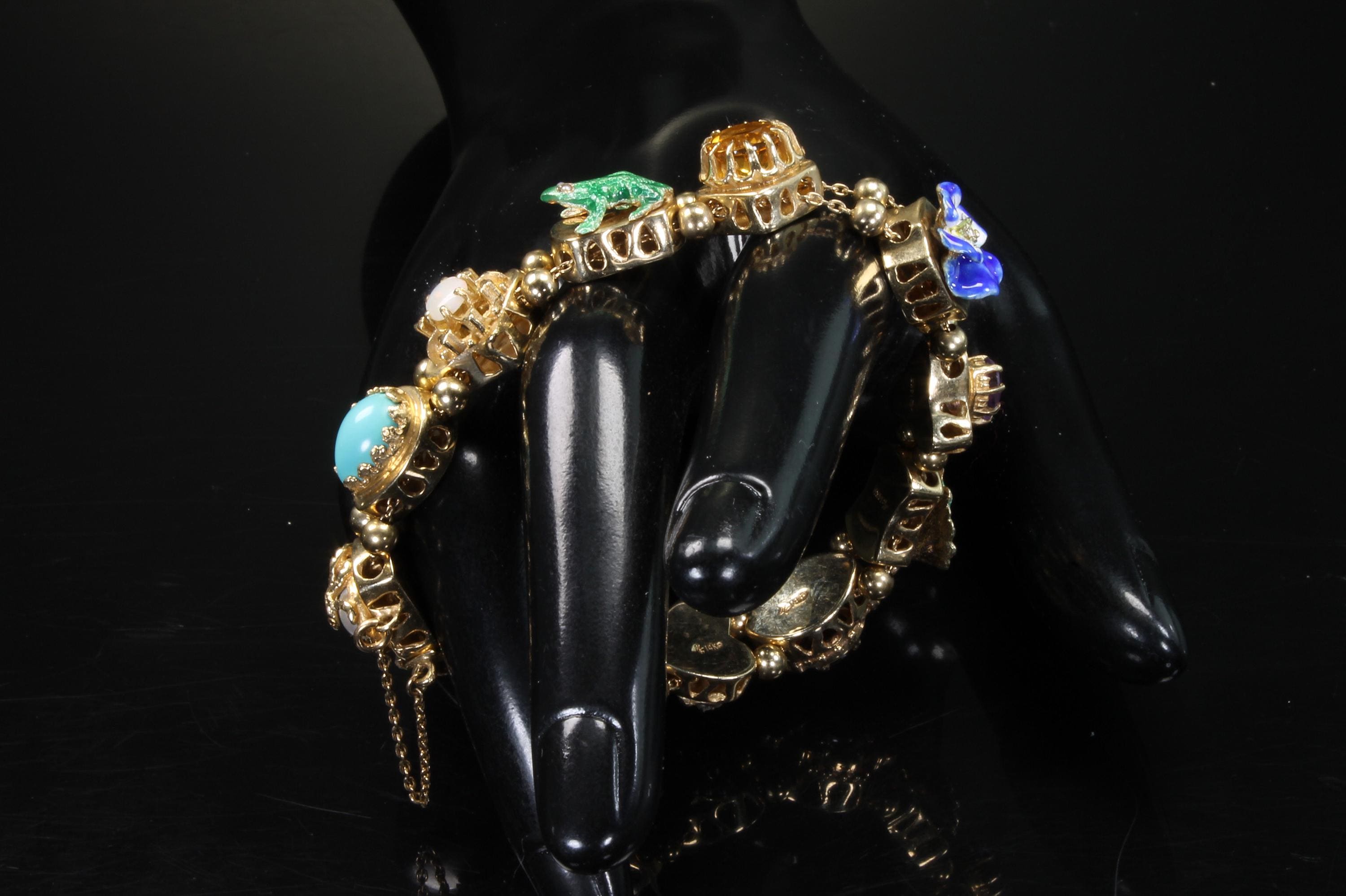 Now THIS is arm candy! Spectacular 14K yellow gold Victorian style charm bracelet. Weighing in at a hefty 23.3 dwt or 36.2 grams this bracelet features enameled critters and plants and gemstones and whimsy and colors and and and!!!! Measuring 7” this bracelets’ clasp works great and the safety chain has a spring ring on it for even easier use. I have not been able to find any damage to the enamel. There are very few signs of wear. This is a vintage and pre owned bracelet, sold as is in ready to wear condition. All the backs of each charm are inscribed with the makers hallmark (MA) and 14K