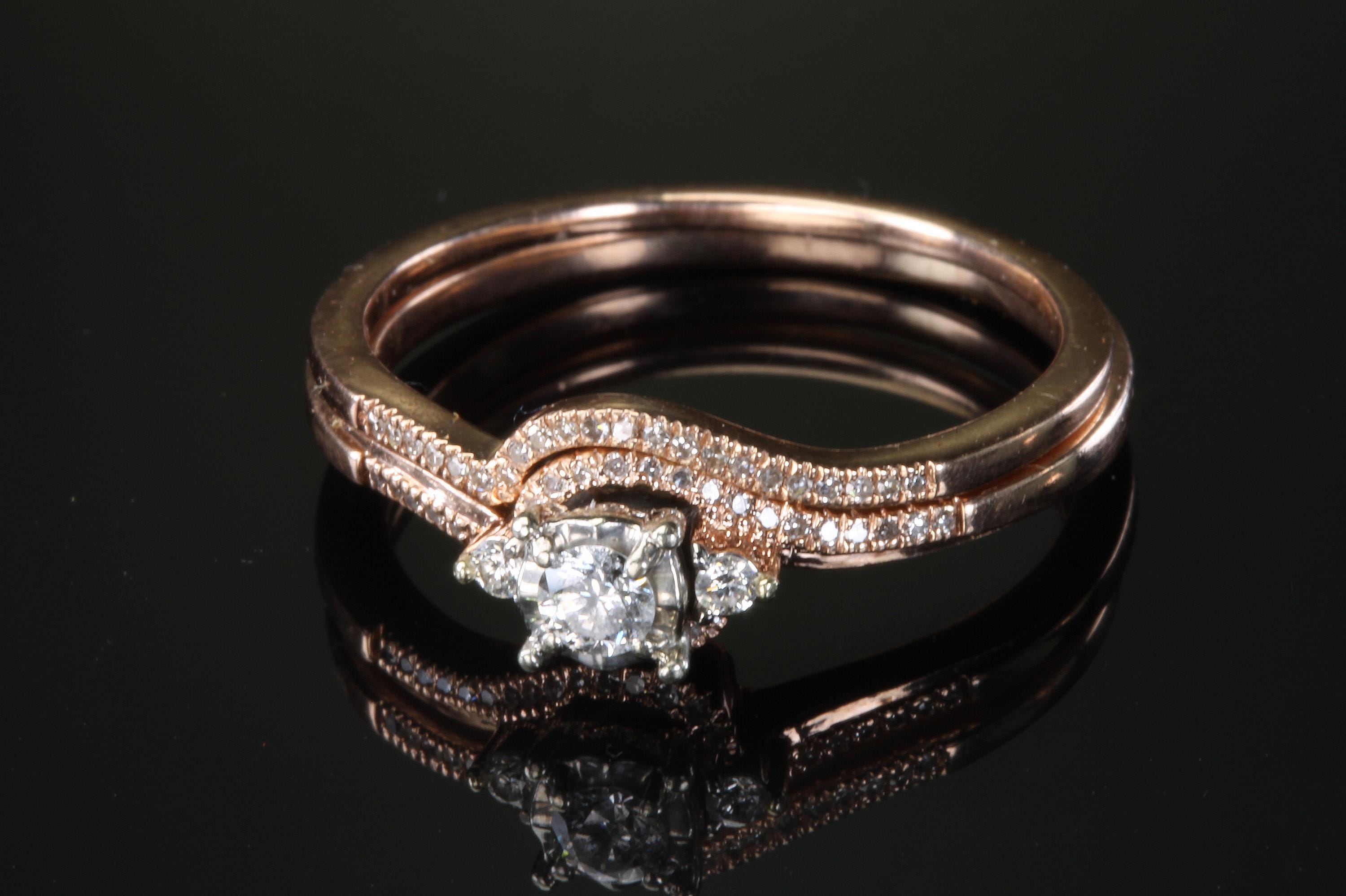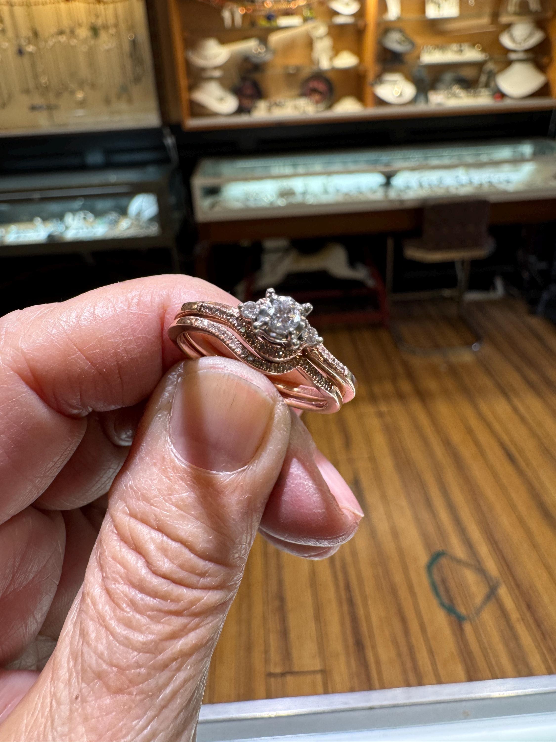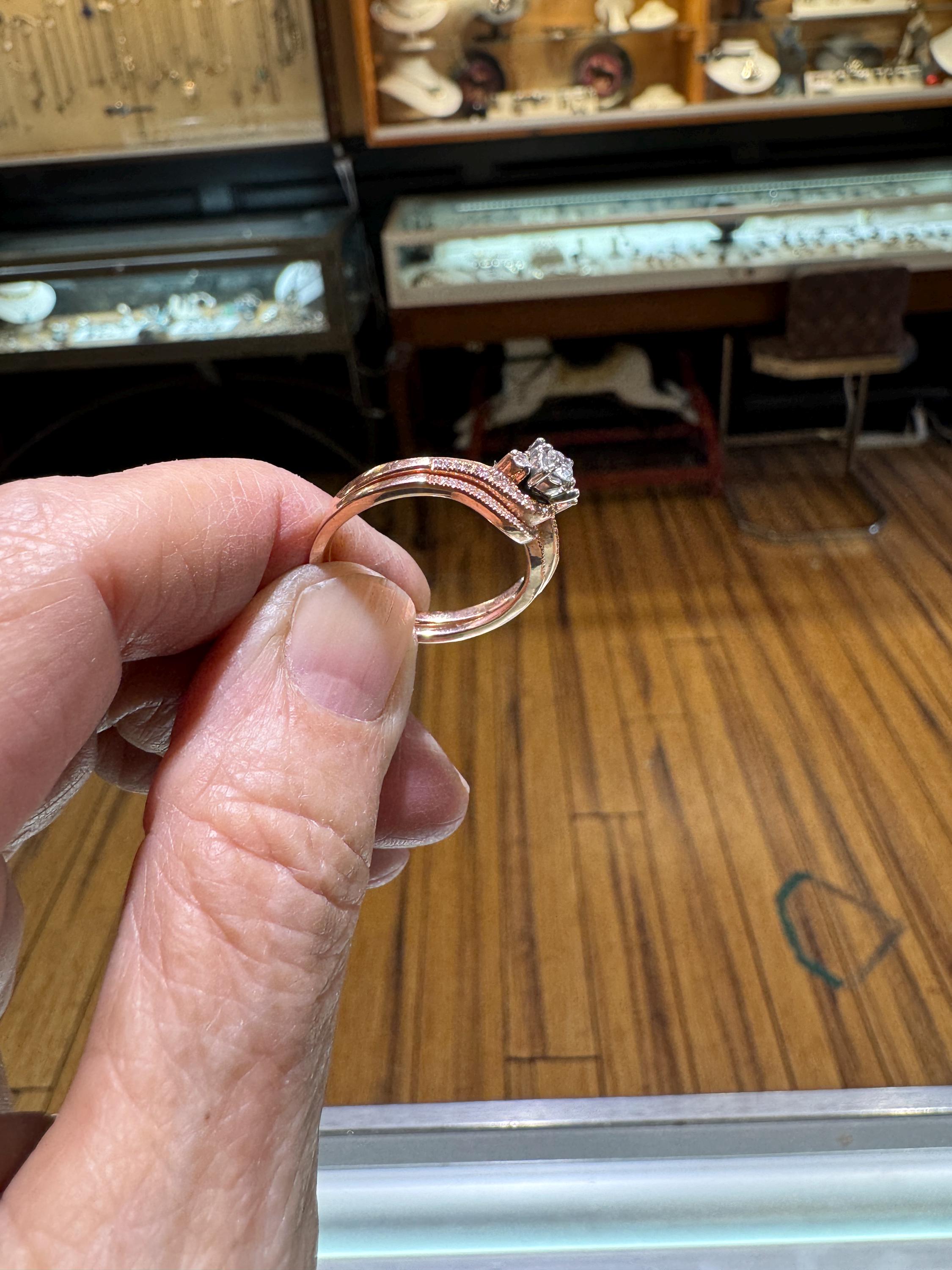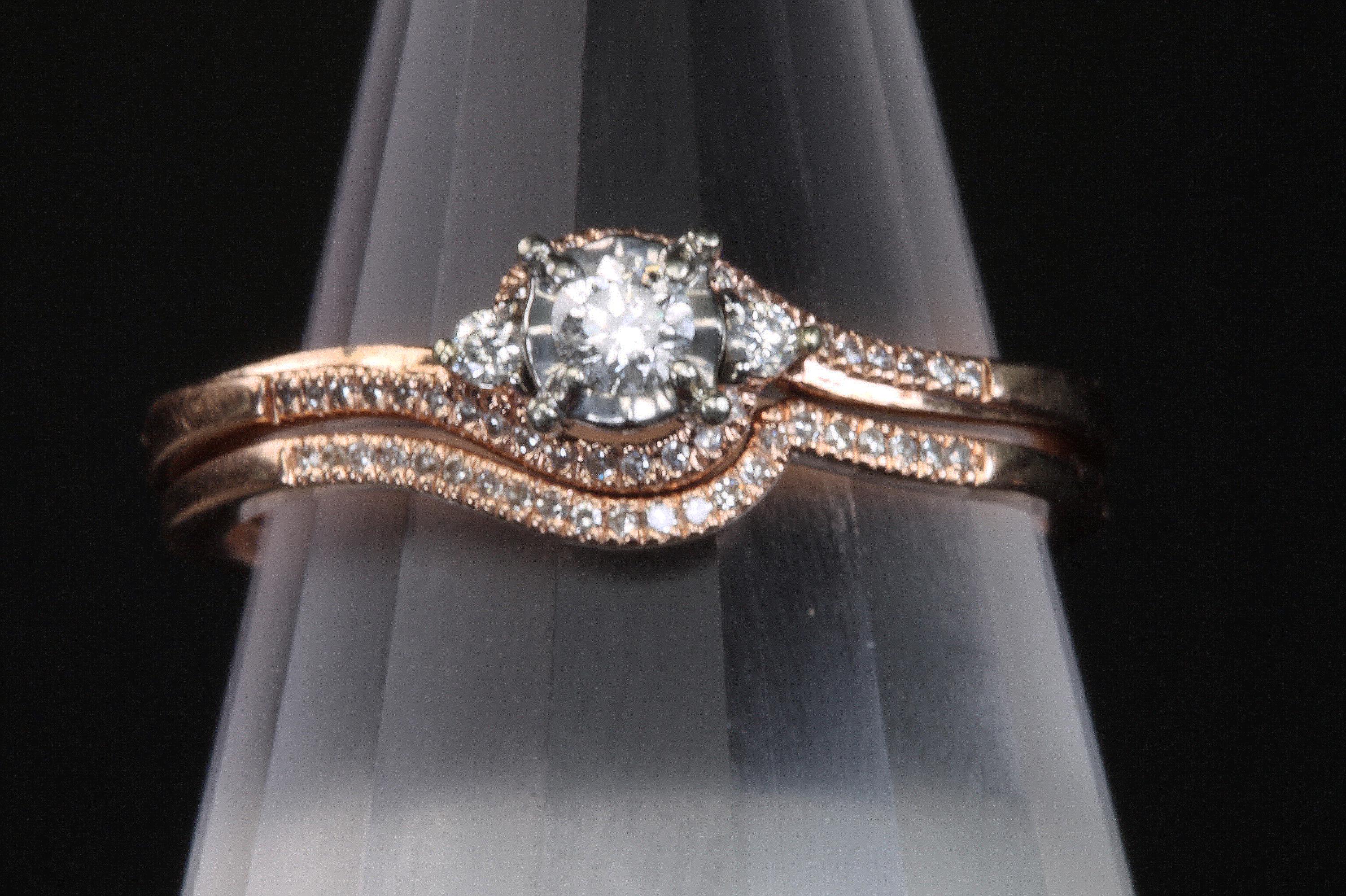A lovely 14K rose gold bridal set with .21ctw of diamonds. I find rose gold to be so feminine, a perfect combination for the perfect day, to wear during a lovely life! Size 9.25 only