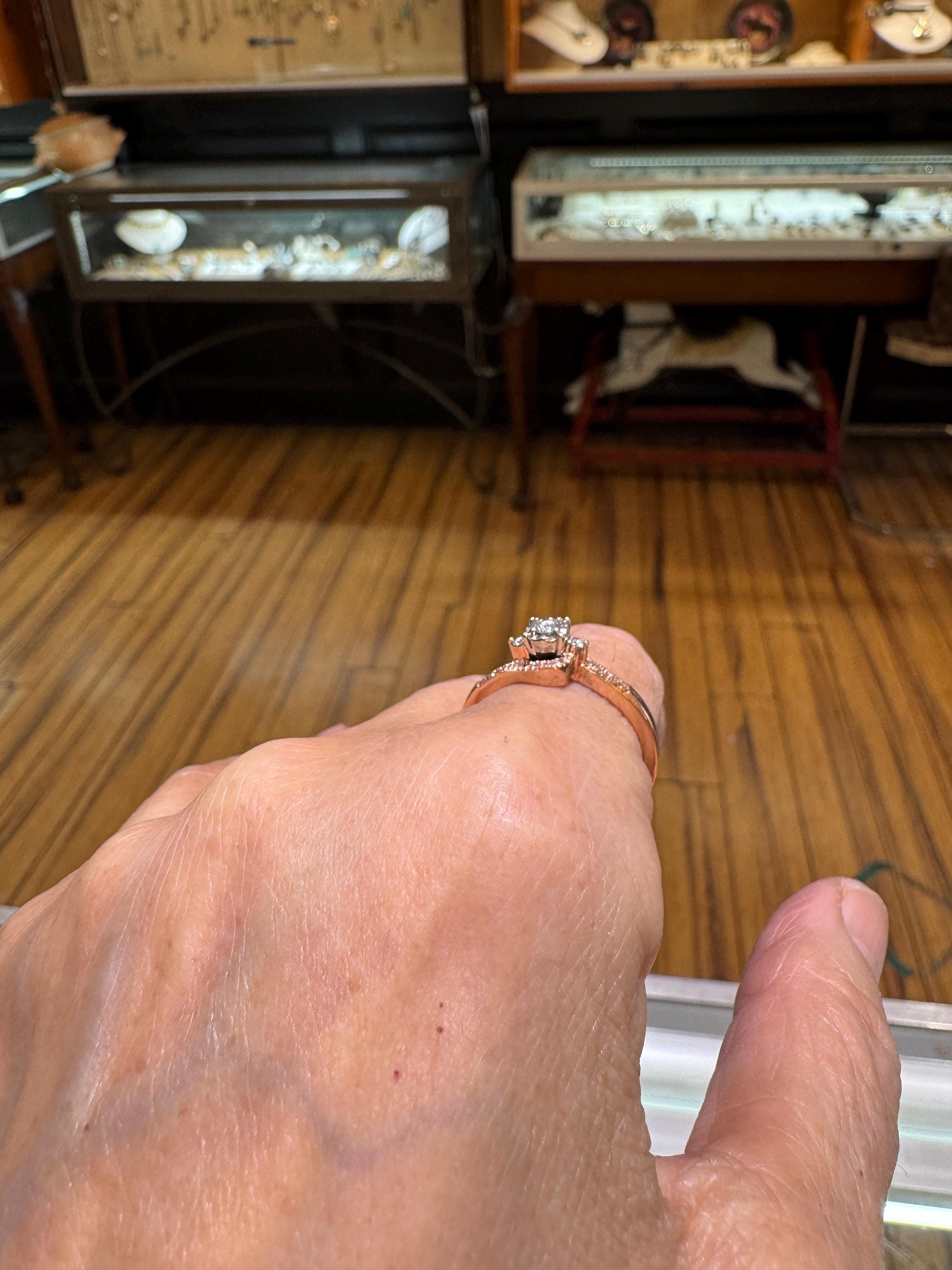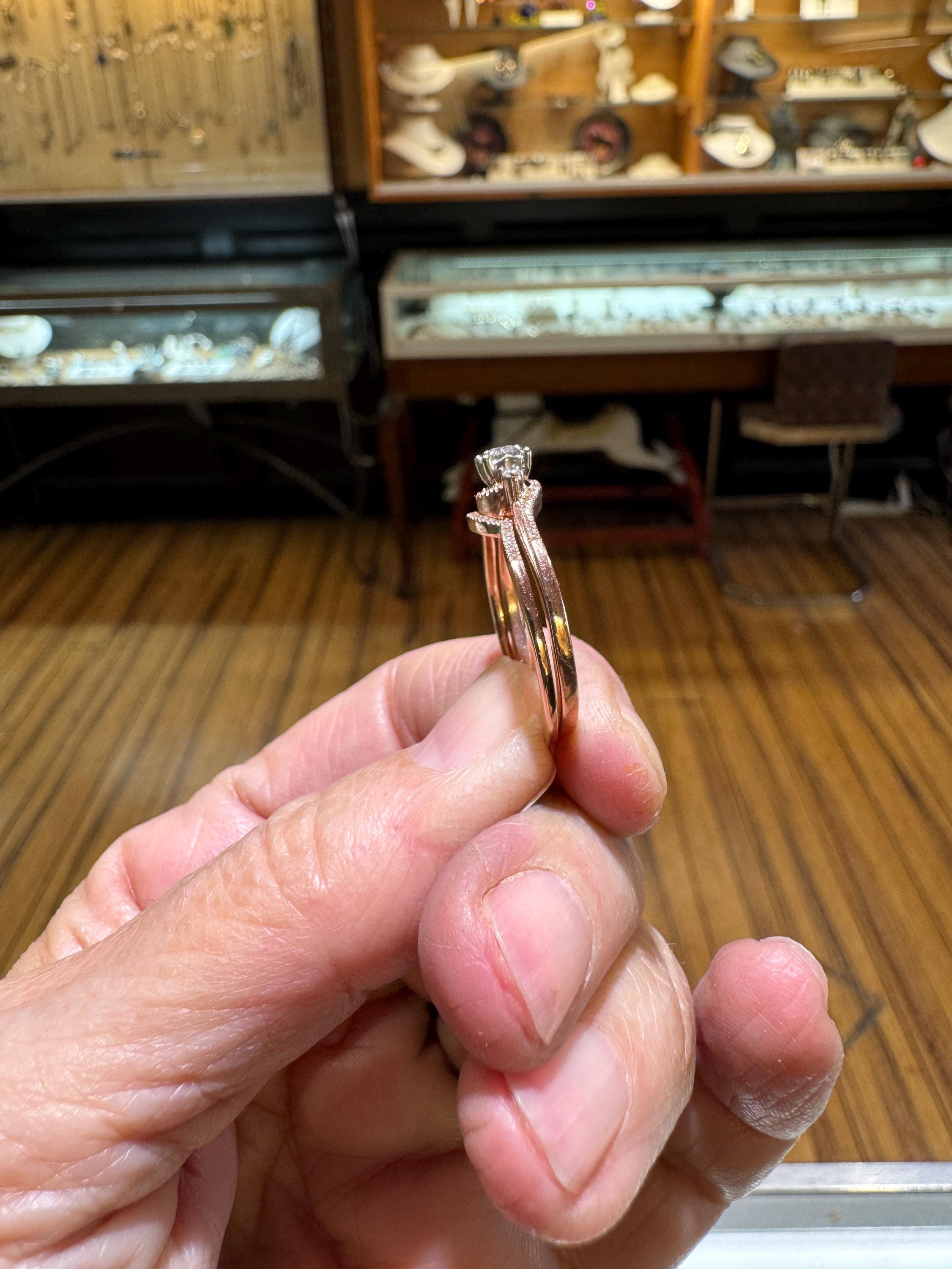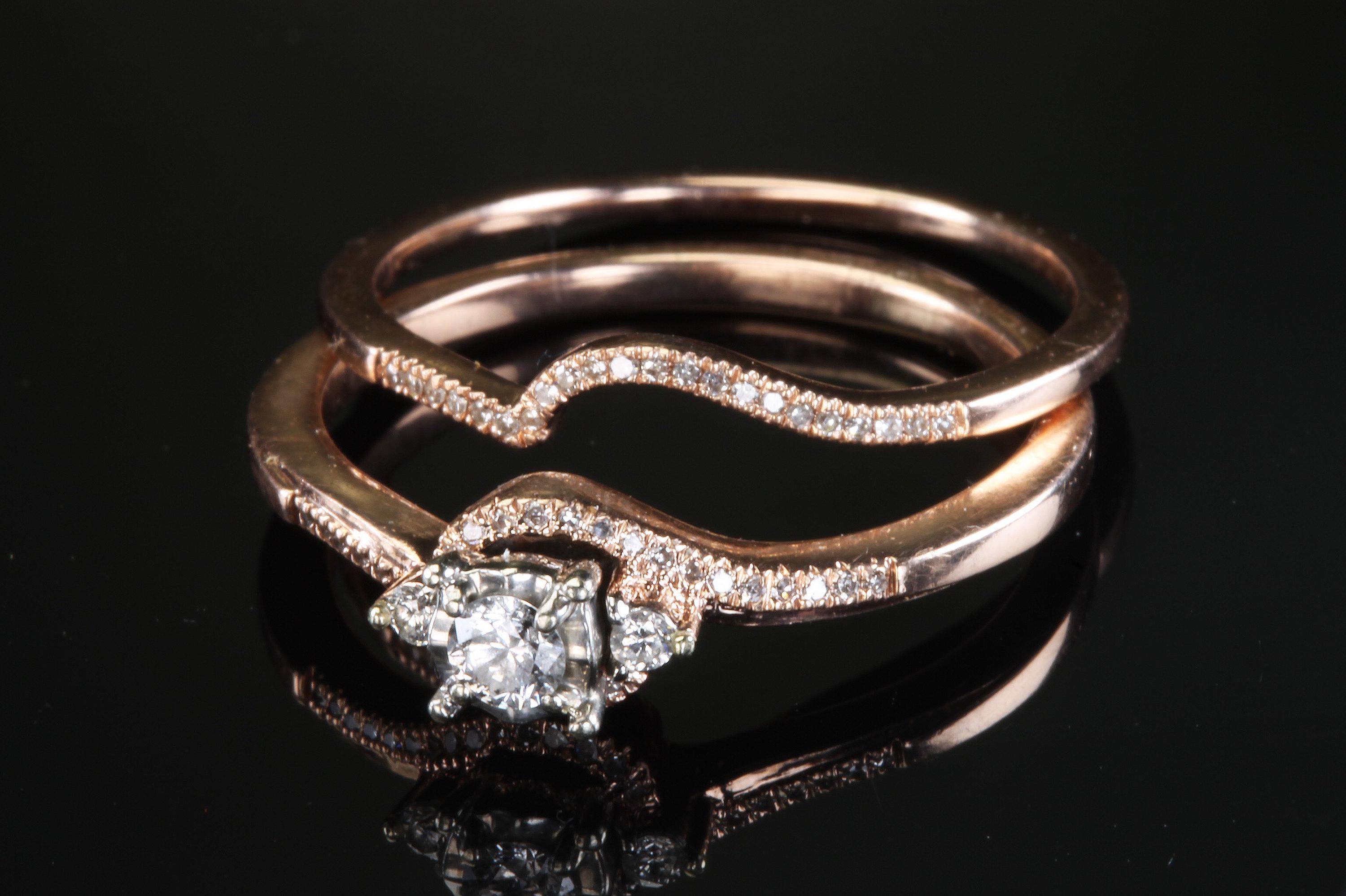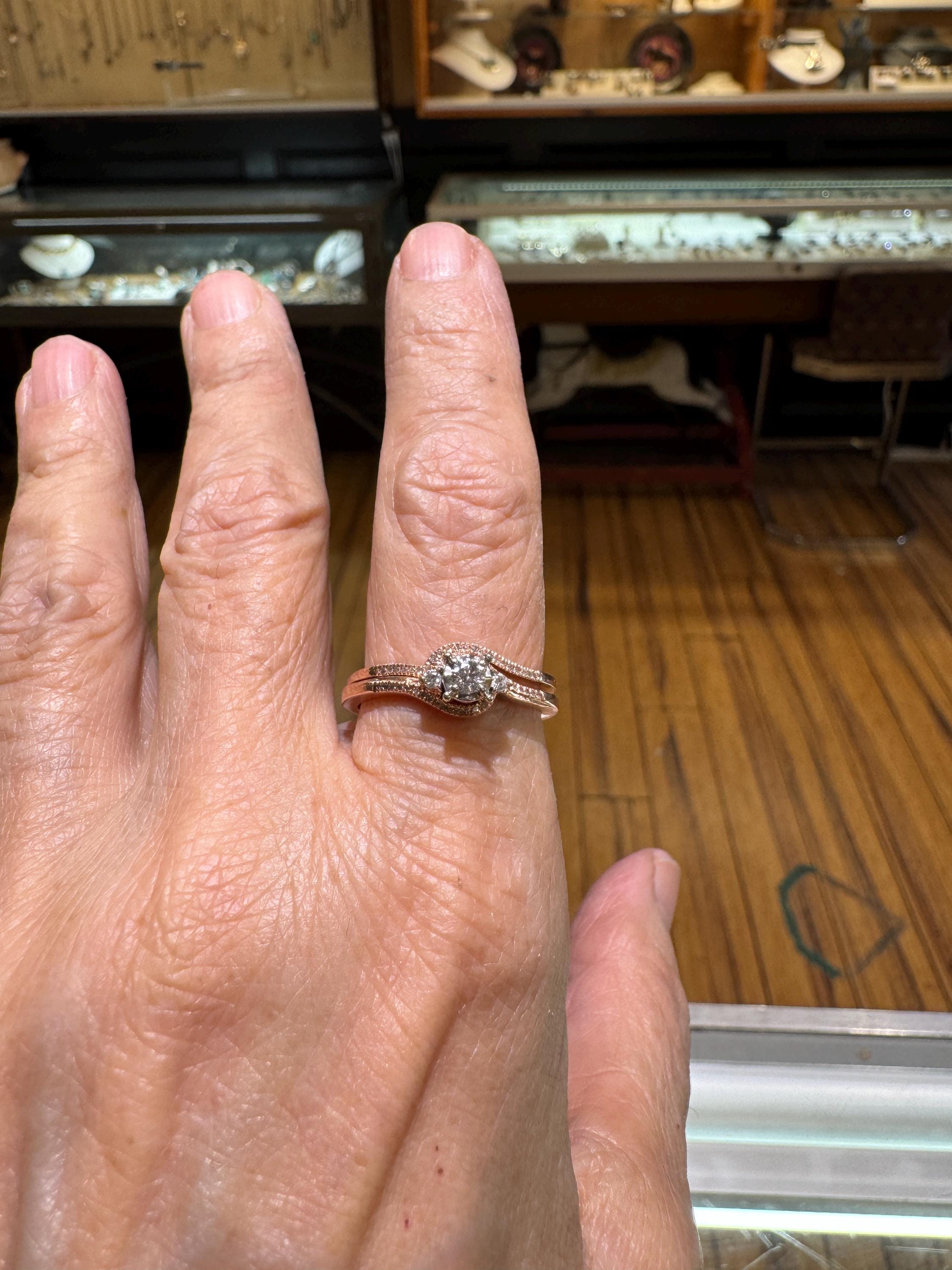 A lovely 14K rose gold bridal set with .21ctw of diamonds. I find rose gold to be so feminine, a perfect combination for the perfect day, to wear during a lovely life! Size 9.25 only